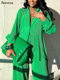 Our sleek and sexy two-piece set is perfect for any office lady who wants to turn heads and make a statement. The sharp lapel jacket and form-fitting trousers are made from high-quality fabric that is both comfortable and stylish. The wide leg trousers are especially flattering, giving you a polished look that is sure to impress.